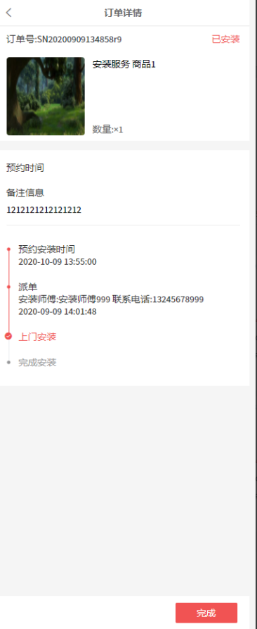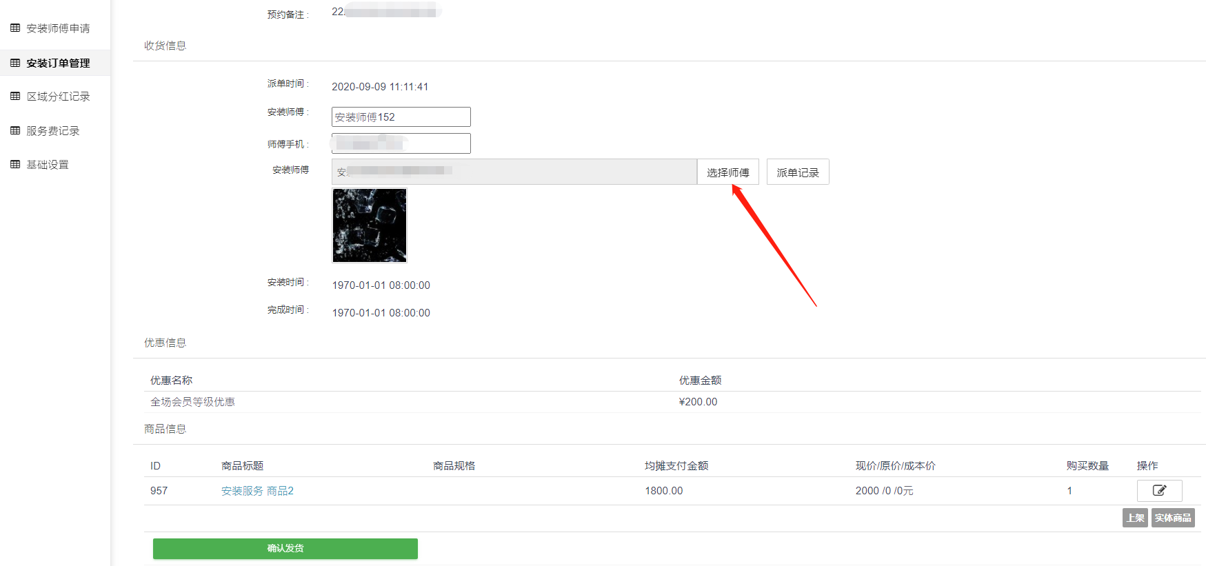 1.用户点击预约安装后,系统会自动指派对应区域的安装师傅上门安装(商家也可在进行更改自行指派安装师傅),其后安装师傅可进入安装师傅插件查看订单详情以及点击上门安装