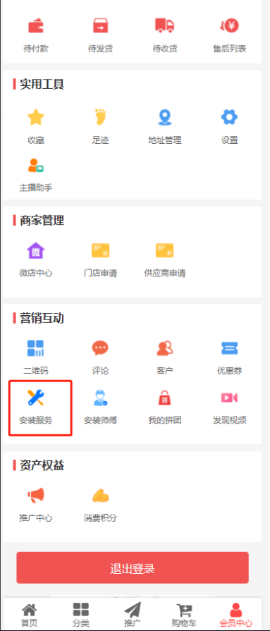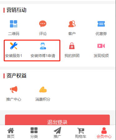 4. 申请被通过审核后台,会员中心入口变为安装服务和安装师傅