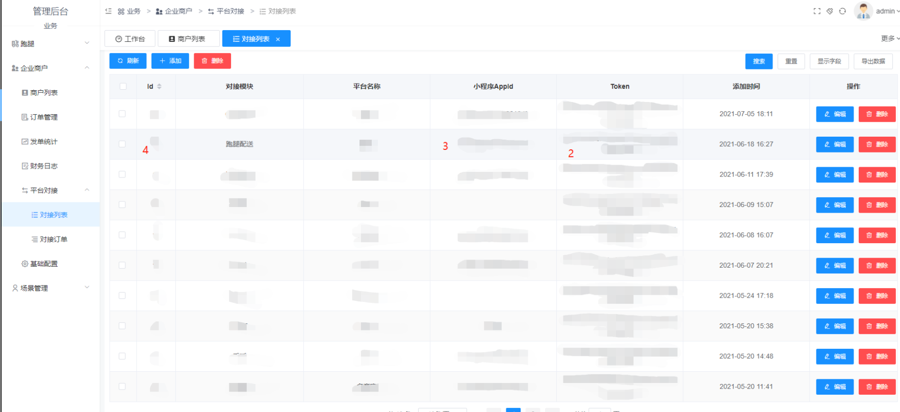 ②接口token,跑腿后台-平台对接-对接列表中对应平台的token。
