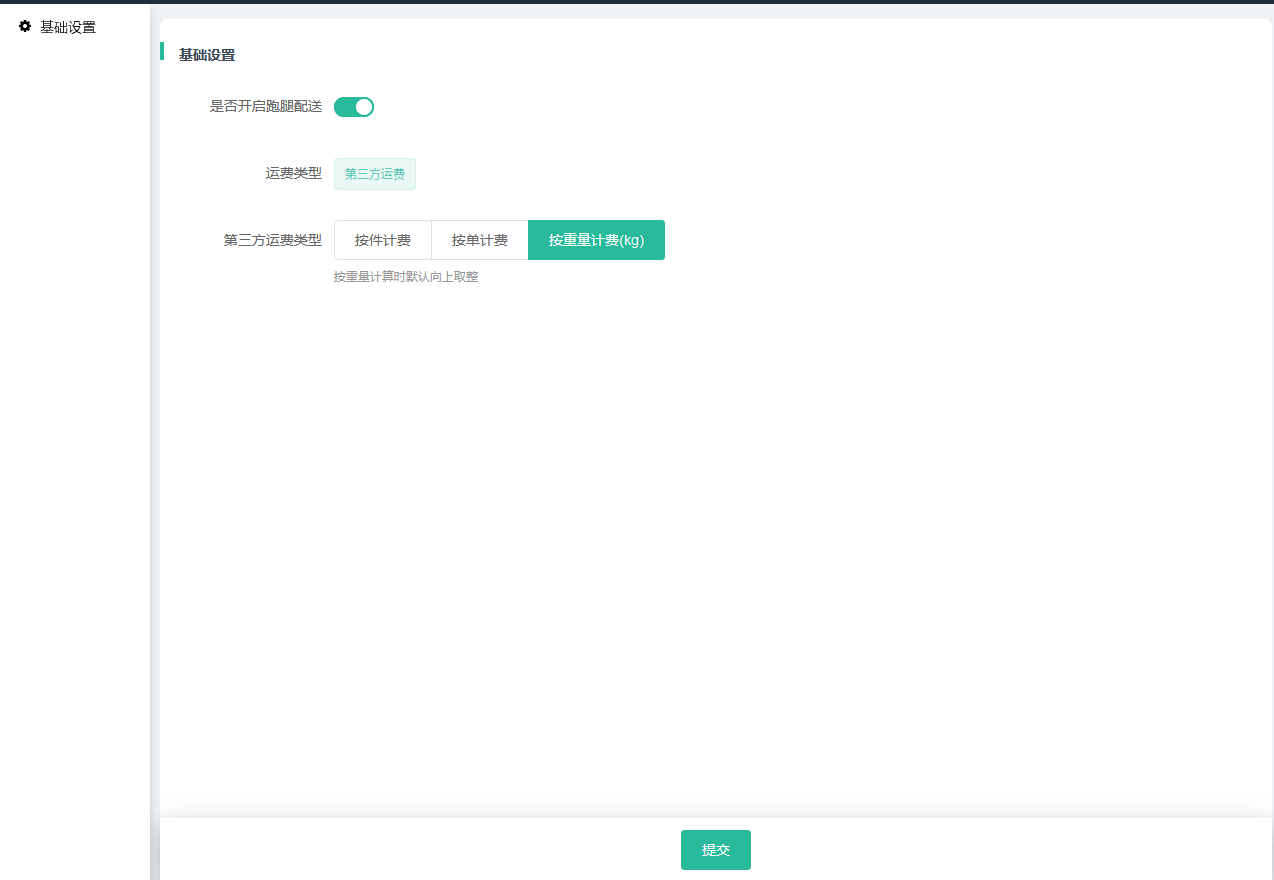 ②设置运费模式,如果设置商城运费或第三方运费,则所有门店都强制走对应的运费,如果设置门店自选,则在门店独立后台自行设置。第三方运费根据跑腿后台设置的运费,再乘以对应的数量(单数、商品件数、商品重量kg向上取整)。