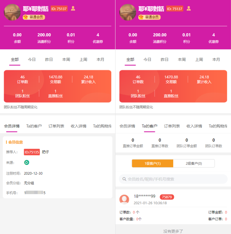利用客户中心功能,会员可以掌握直推和间推客户的喜好动向,持续让他们买买买,以此来获得更多的收益轨迹追踪 推荐客户详情查看 全方位跟进客户动态。支持微信端、小程序端,若需要轨迹追踪,要搭配“浏览轨迹”插件使用!