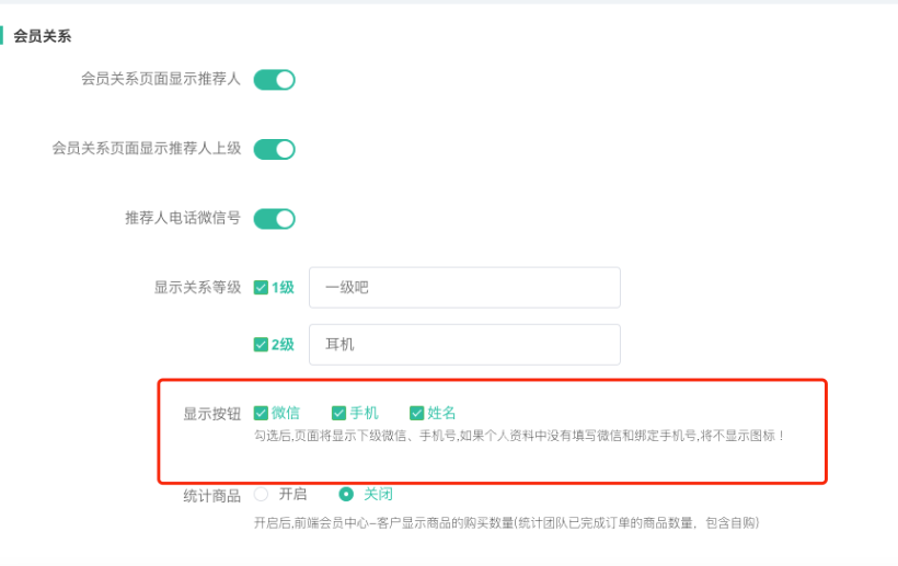 客户中心页面,只有直推/间推客户列表微信、手机、姓名会随会员设置--会员中心显示--会员关系--显示按钮设置显示,其他都不会随设置页面的设置控制显示。