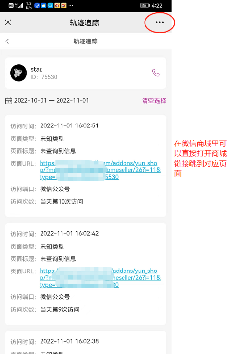 4、在小程序商城,上线浏览下线商城轨迹,若是小程序路径,可以点击跳转对应页面,若是微信商城链接,支持复制,无法直接跳转